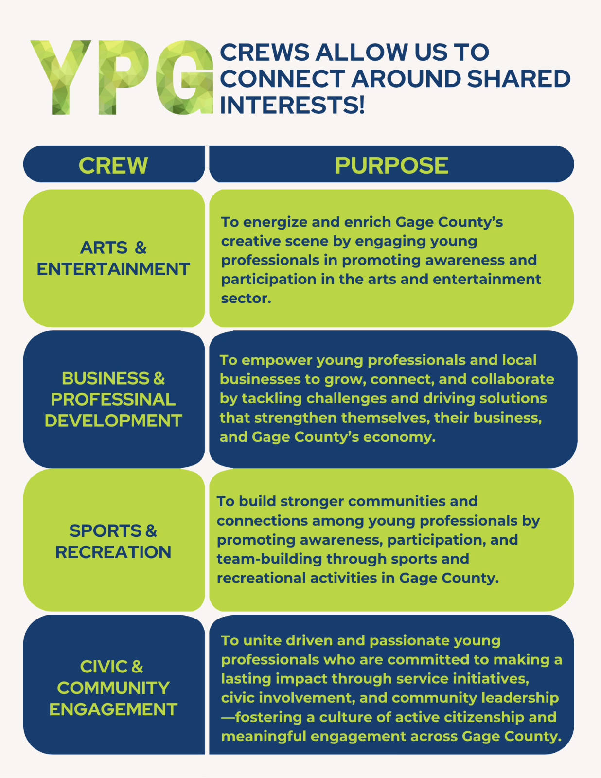 Our YPG Advisory Committee knows that great ideas come from passionate people. That’s why our Advisory Committee is broken into “crews”—small, focused groups that plan events based on shared interests. Whether it's community service, networking, professional development, or social activities, each crew brings energy and creativity to the table.